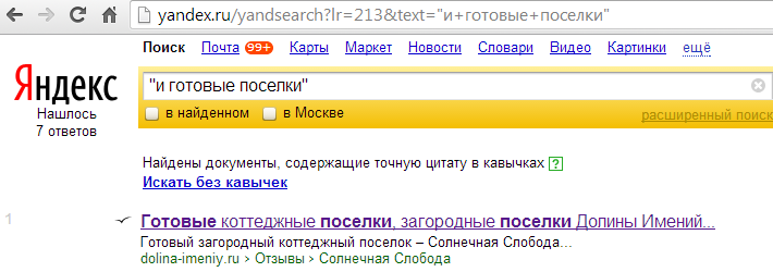 Пример: по запросу "и готовые поселки" на первом месте находится сайт, который не имеет этого точного вхождения в текст, значит он ранжируется благодаря анкорной составляющей из ссылки. Но теперь Яндекс перестал писать, что это НпС (видимо, чтобы прикрыть "отключение" ссылок)