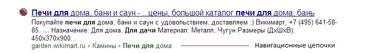Сниппет состоит из заголовка, описания документа и дополнительной информации - url, телефон, регион, адрес организации, ссылки на страницы в соц.сетях. Также, для больших и хорошо структурированных сайтов, в сниппете могут присутствовать быстрые ссылки и навигационные цепочки.