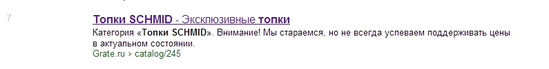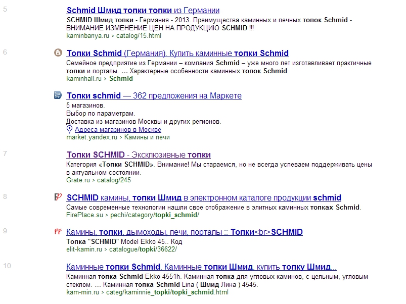 Даже находясь, например, на 6 строчке, вы можете получать весьма небольшое кол-во переходов, если сниппет будет плохим - в отличии от результата на 8 месте с хорошим сниппетом. Приведем пример ТОП-10 выдачи по запросу [топки schmid], а именно 5-10 места: