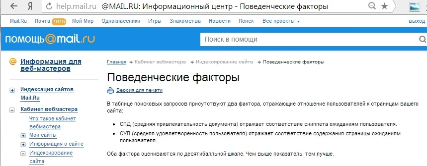 Поисковая система Mail.ru не скрывает то, что поведенческие факторы напрямую влияют на ранжирование сайта в выдаче. у Mail.ru имеется свой кабинет вебмастера в котором доступна следующая информация..