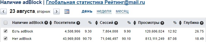 Глубина просмотра у пользователей, использующих блокировщиков рекламы в среднем почти в 2 раза выше, чем у остальных посетителей сайтов. Такие выводы можно сделать из данных представленных top.mail.ru.