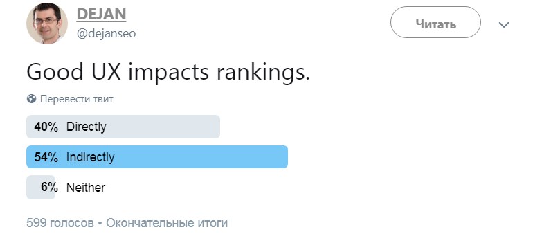 В голосовании поучаствовали почти 600 вебмастеров и оптимизаторов. И лишь, малая часть, а именно 6% из них ответили, что UX никак не влияет на ранжирование.
