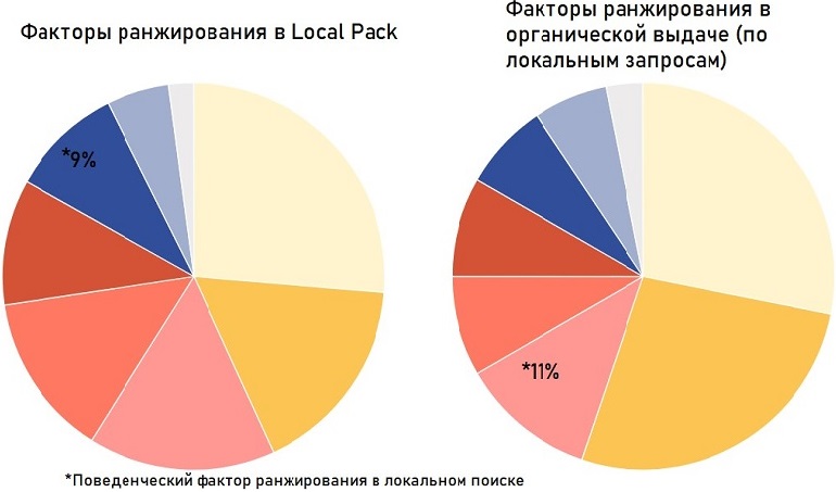 По данным Moz, влияние поведенческих факторов на ранжирование в органической выдаче Google (по локальным запросам) ~11%, в блоке с картой (Local Pack с тремя компаниями) – чуть меньше, 9%.
