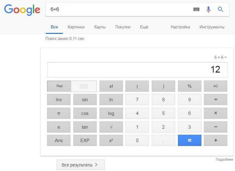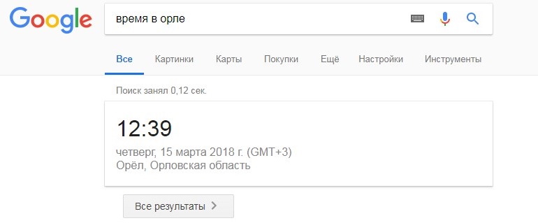 Новый тип SERP отображается по отдельному типу запросов, таким как [время в Альбукерке] или [время в Орле]. В поисковой выдаче Google отображает ответ и кнопку для показа остальных результатов “Все результаты”.