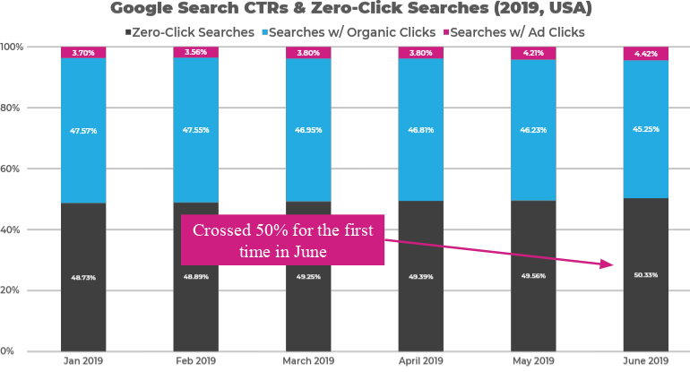 В июле этого года доля no-click запросов к Google в Америке впервые пробила отметку более 50%. В первом квартале 2019 года их доля была меньше половины, а именно 48,96%.