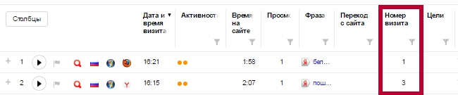 Показатели в столбце визита больше “1” показывают, что это вернувшийся посетитель.