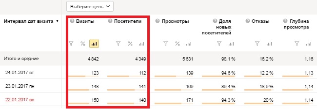На странице статистики по поисковым системам можно сделать выборку количества визитов и количества посетителей. Посетители — это уникальные заходы. Показатель «Визиты» учитывает, в том числе и вернувшихся.