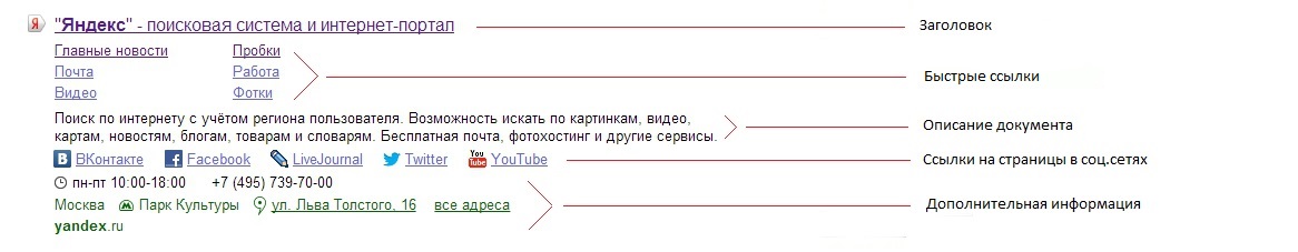 Сниппет состоит из заголовка, описания документа и дополнительной информации - url, телефон, регион, адрес организации, ссылки на страницы в соц.сетях. Также, для больших и хорошо структурированных сайтов, в сниппете могут присутствовать быстрые ссылки и навигационные цепочки.